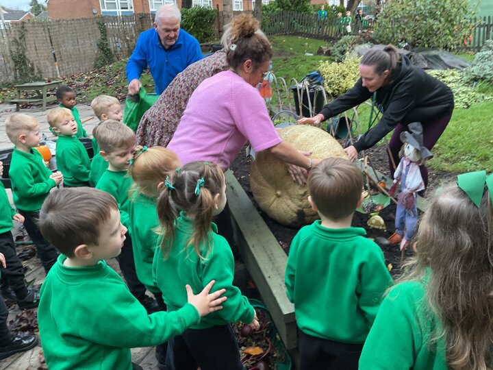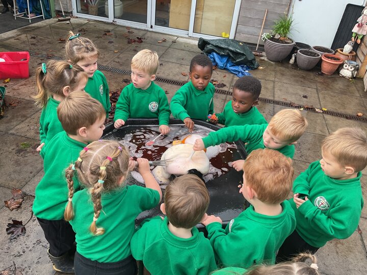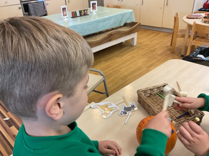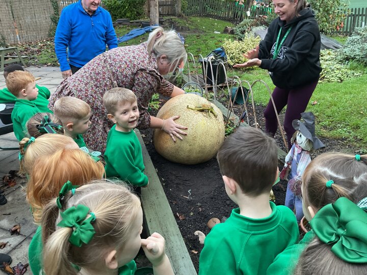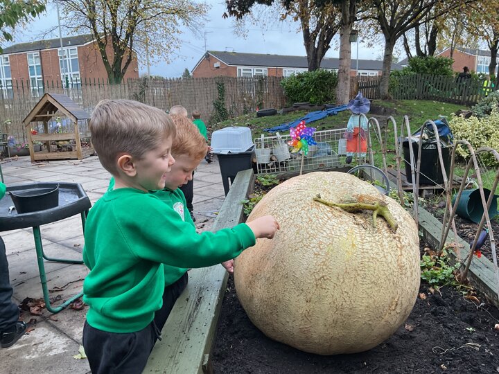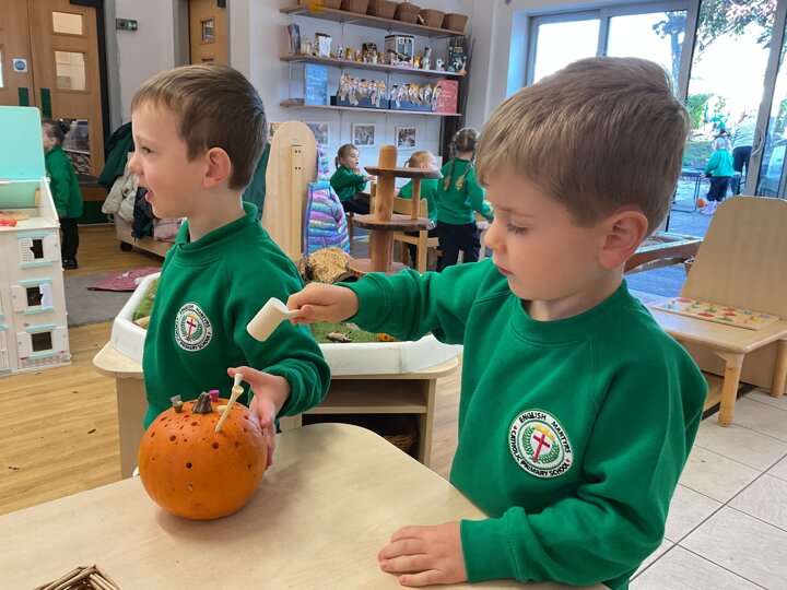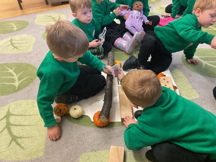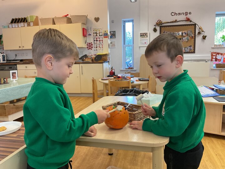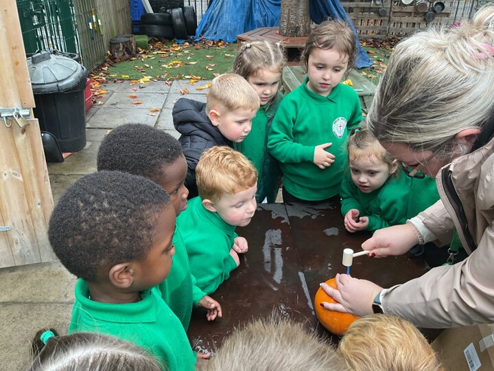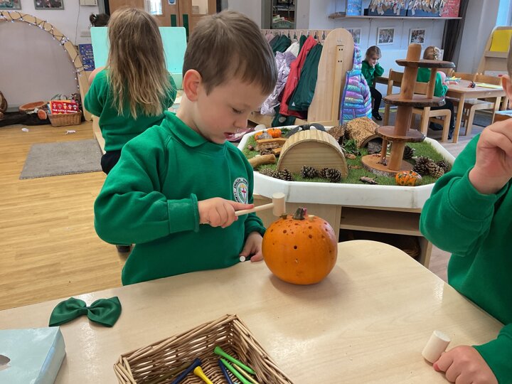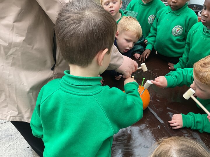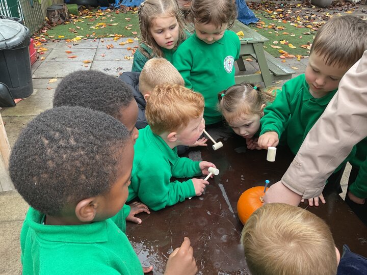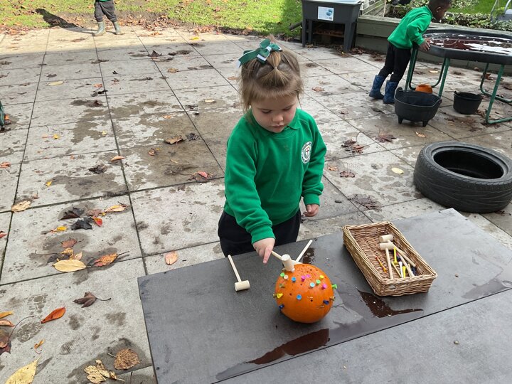 Over the past few weeks the children have been really interested in pumpkins. They have brought pumpkins in to use in our learning, and told us about visits to pumpkin patches. We have used pumpkins in our maths counting and comparing activities, created and investigated pumpkin potions, shared books pumpkins and used golf tees and wooden hammers to make holes in pumpkins to develop our fine motor skills. We also been using pumpkins in our independent play both inside and outside. On Wednesday we baked pumpkin muffins. To top it off we received a very generous donation of a huge pumpkin for our nursery garden which has been very popular with visitors from other year groups!