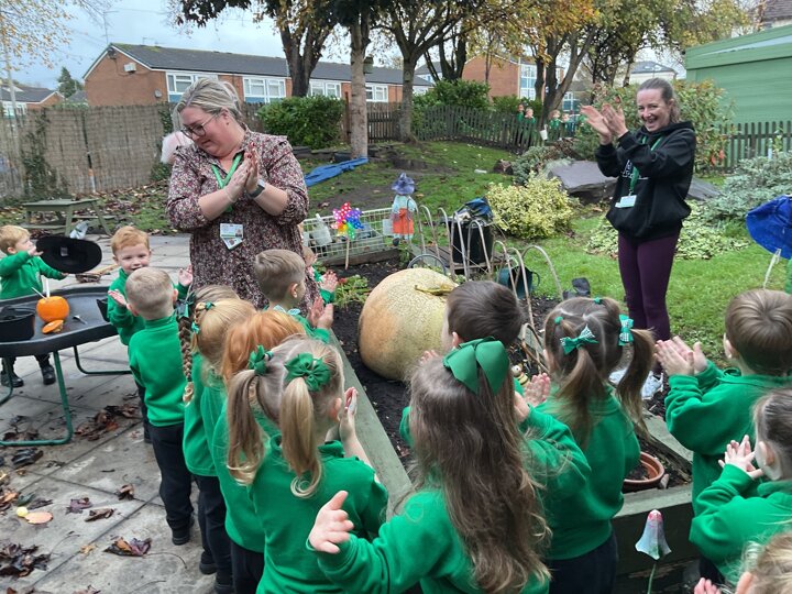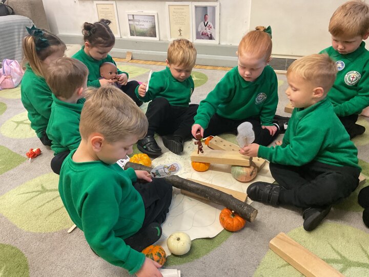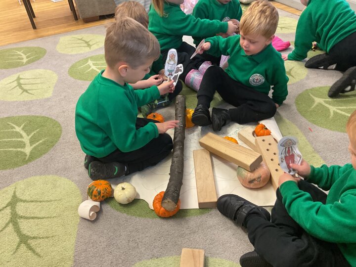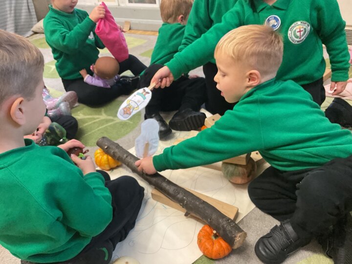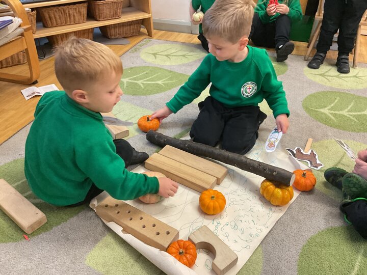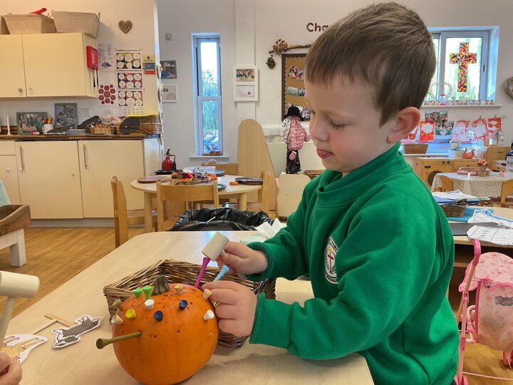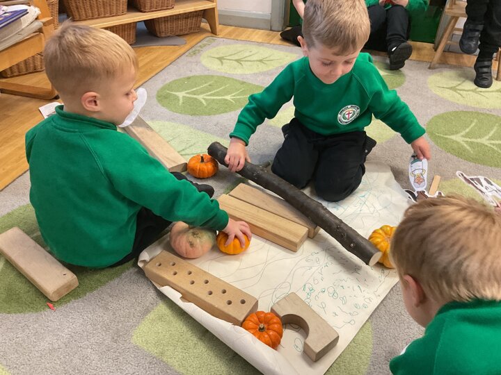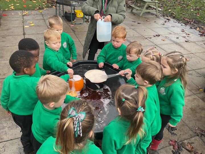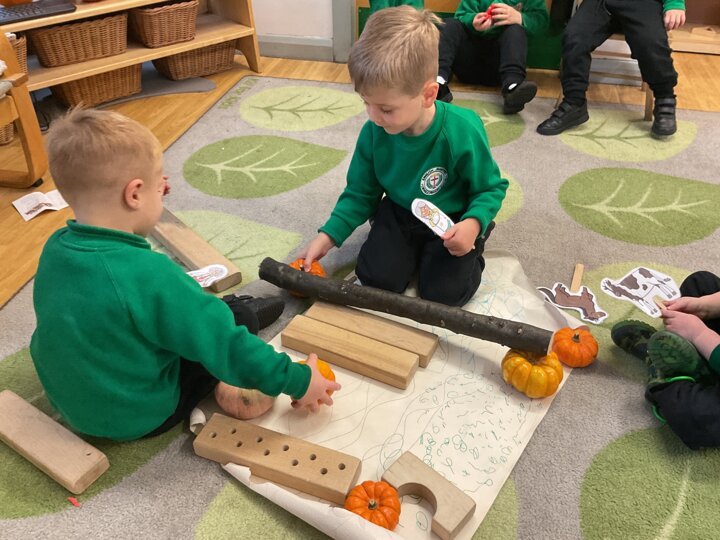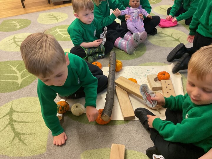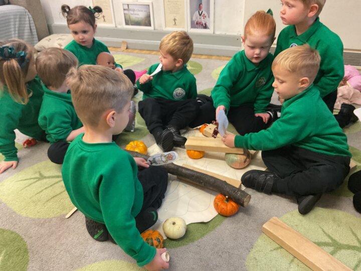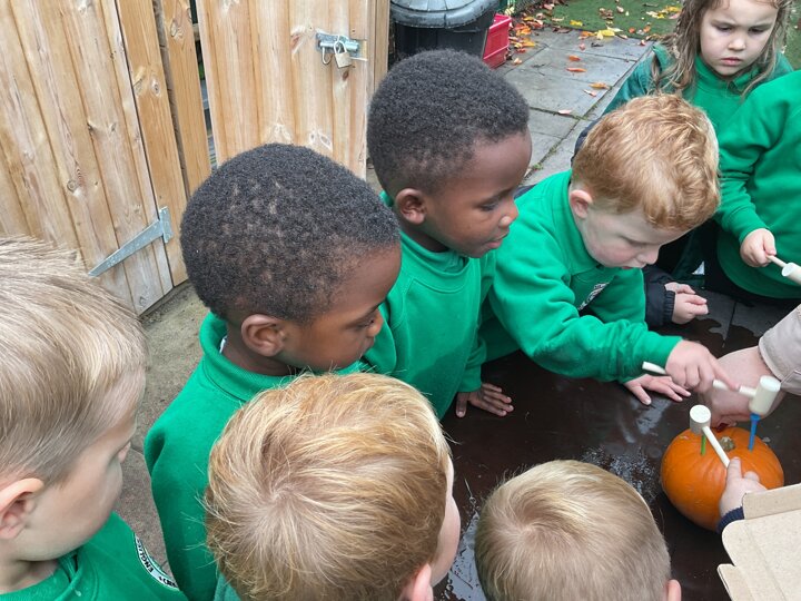 Over the past few weeks the children have been really interested in pumpkins. They have brought pumpkins in to use in our learning, and told us about visits to pumpkin patches. We have used pumpkins in our maths counting and comparing activities, created and investigated pumpkin potions, shared books pumpkins and used golf tees and wooden hammers to make holes in pumpkins to develop our fine motor skills. We also been using pumpkins in our independent play both inside and outside. On Wednesday we baked pumpkin muffins. To top it off we received a very generous donation of a huge pumpkin for our nursery garden which has been very popular with visitors from other year groups!