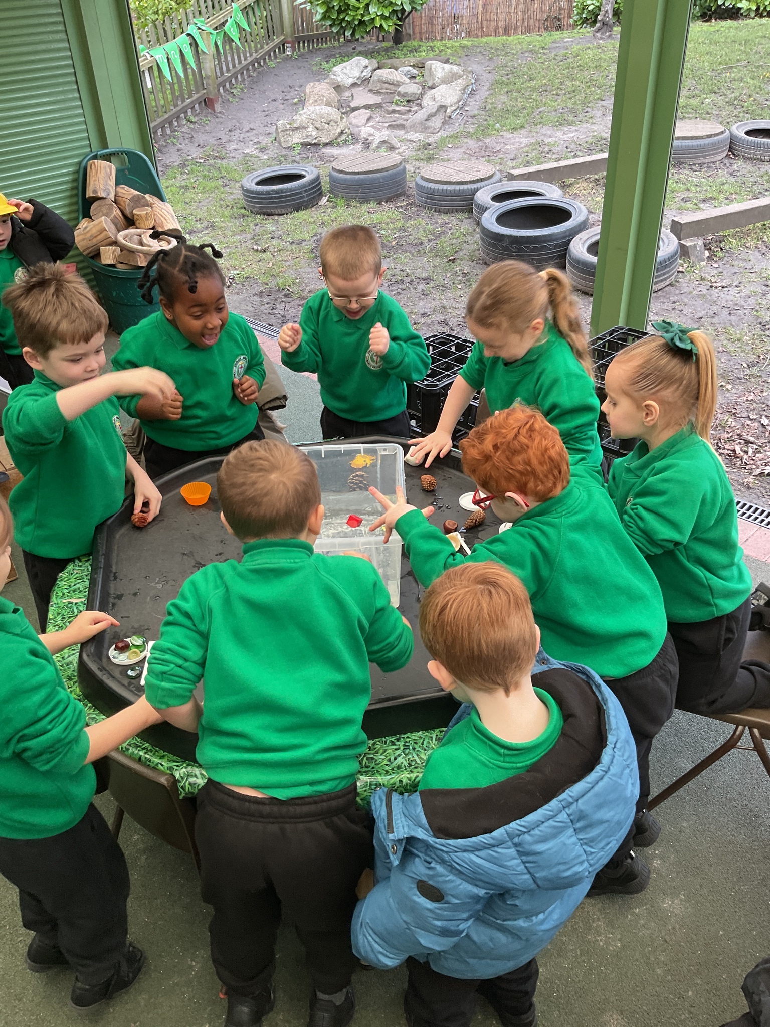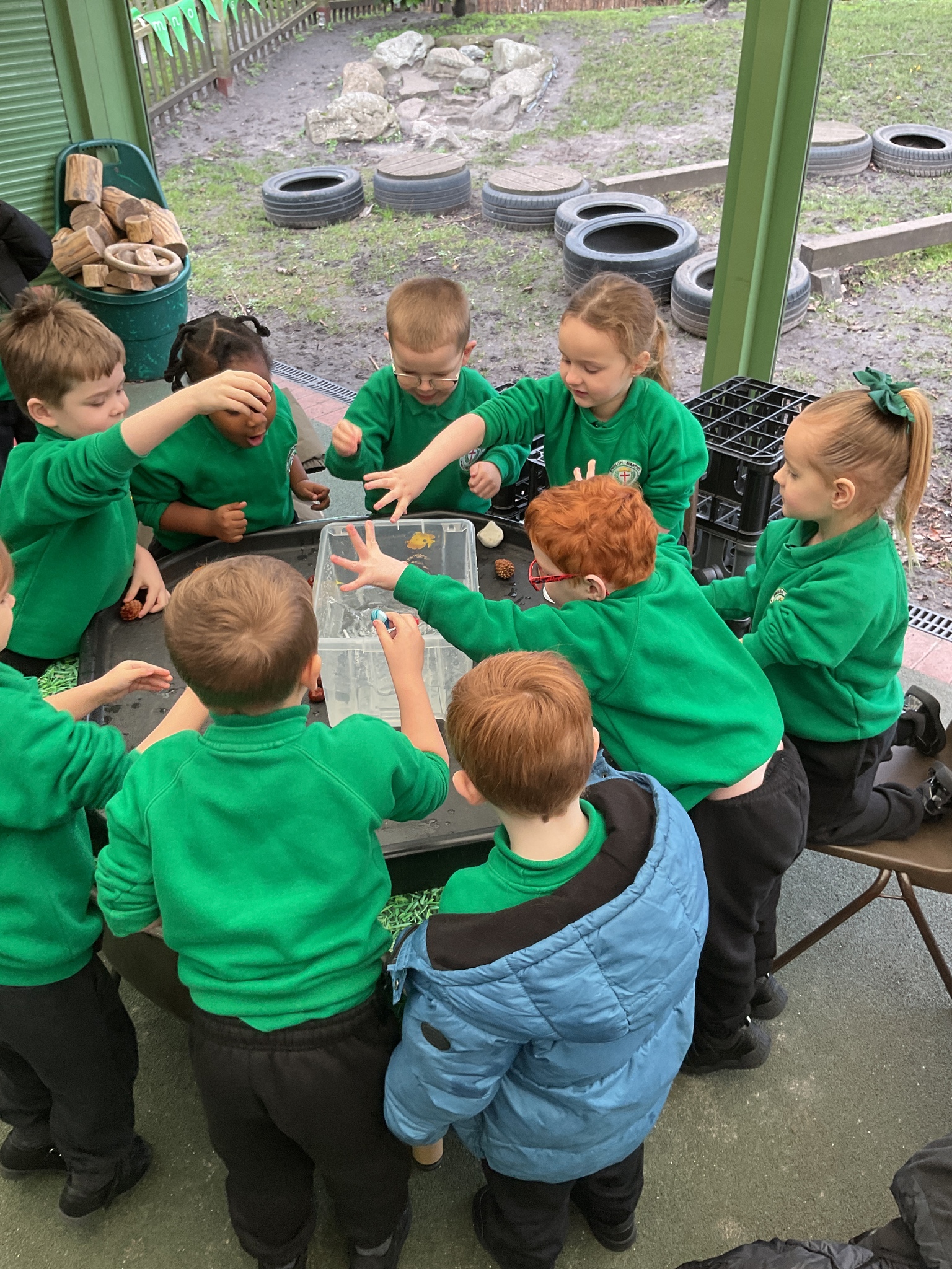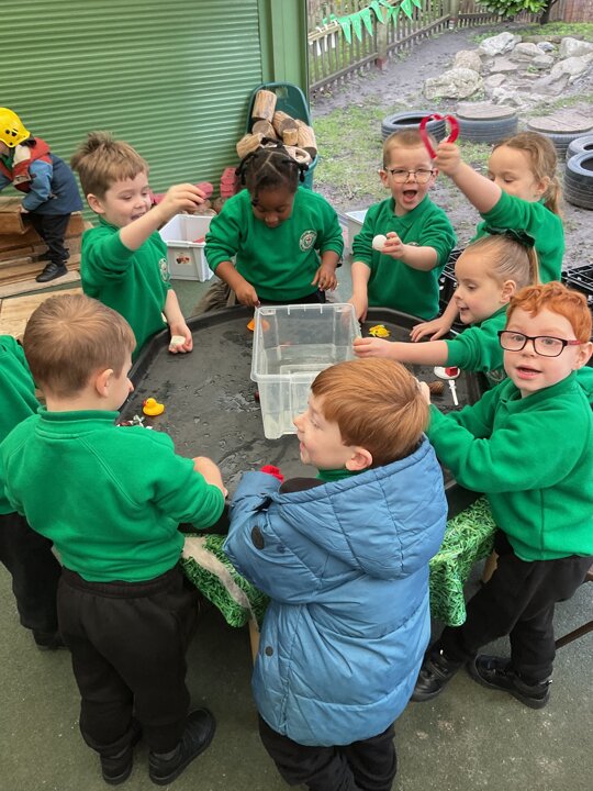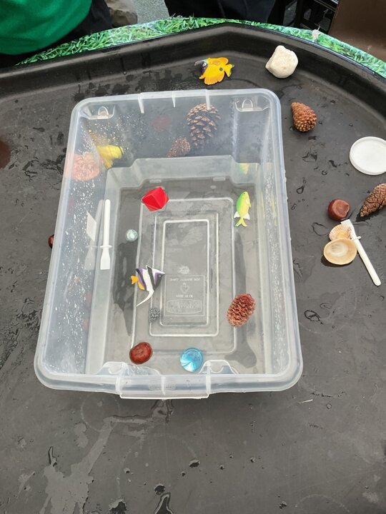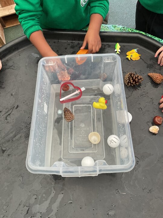 Today in the outdoor resource are the children are investigating classroom objects to see if they float or sink in a bowl of water. They were very excited to see if their predictions were correct or not!