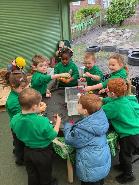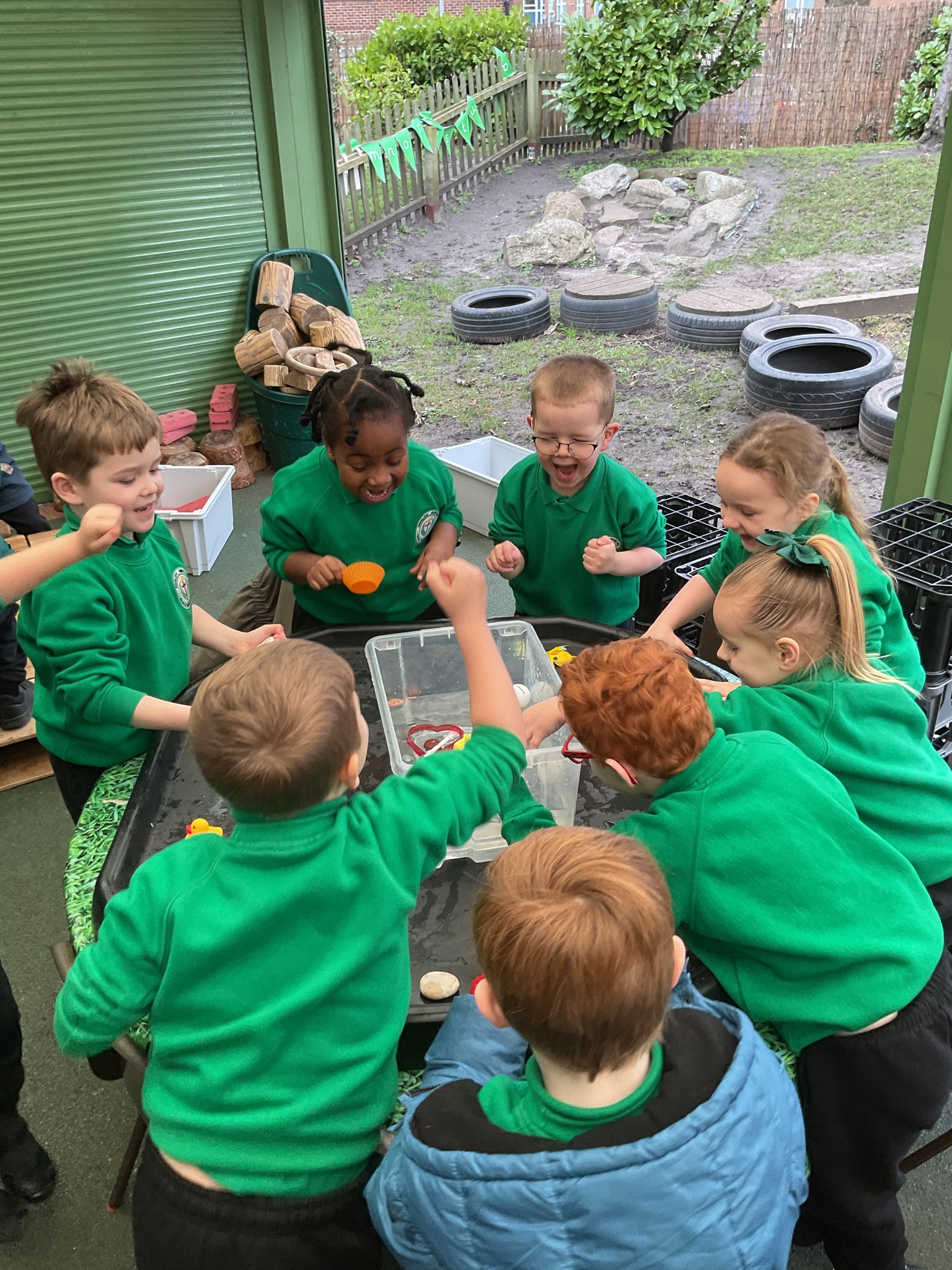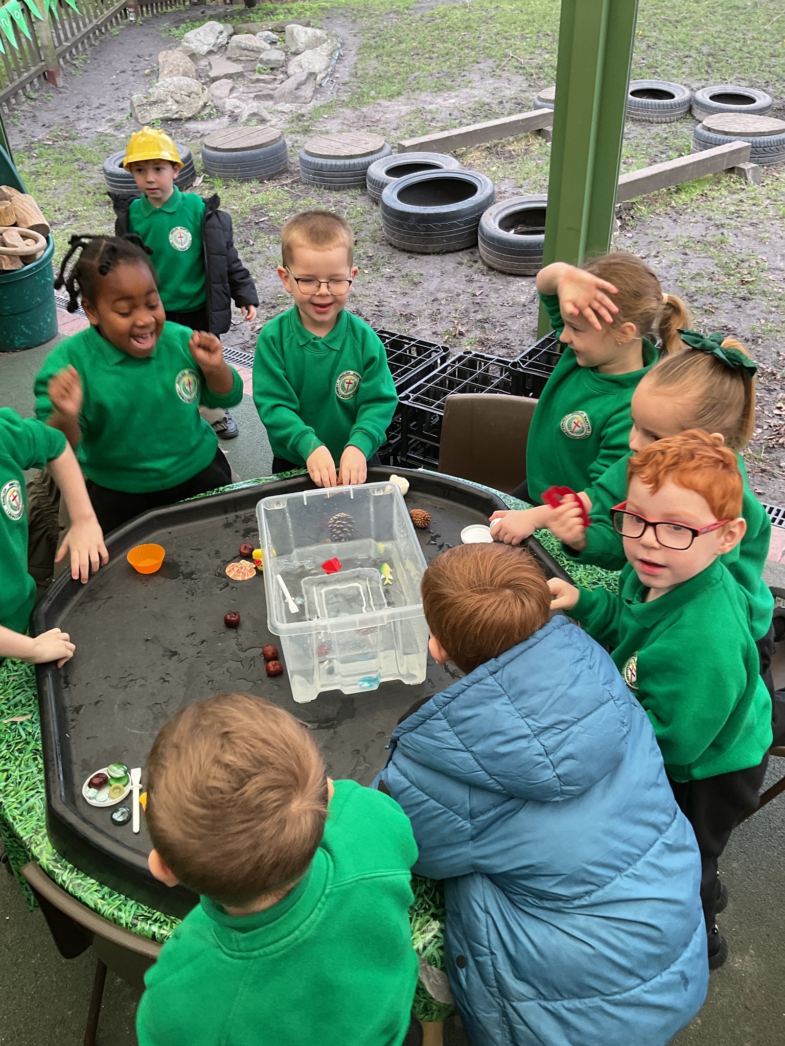 Today in the outdoor resource are the children are investigating classroom objects to see if they float or sink in a bowl of water. They were very excited to see if their predictions were correct or not!