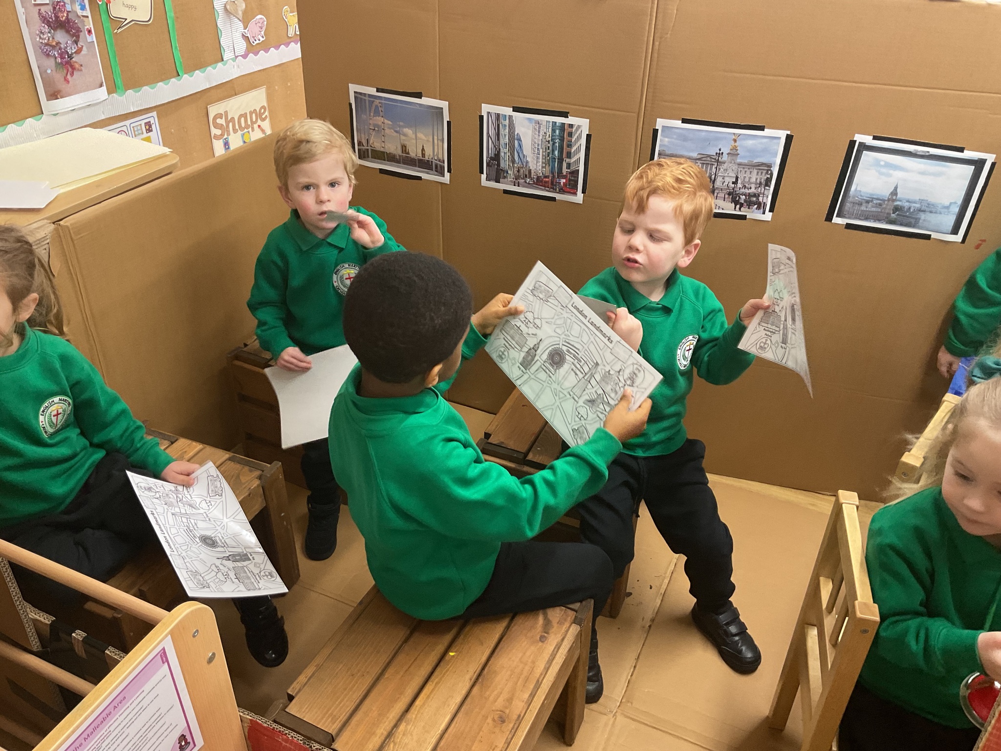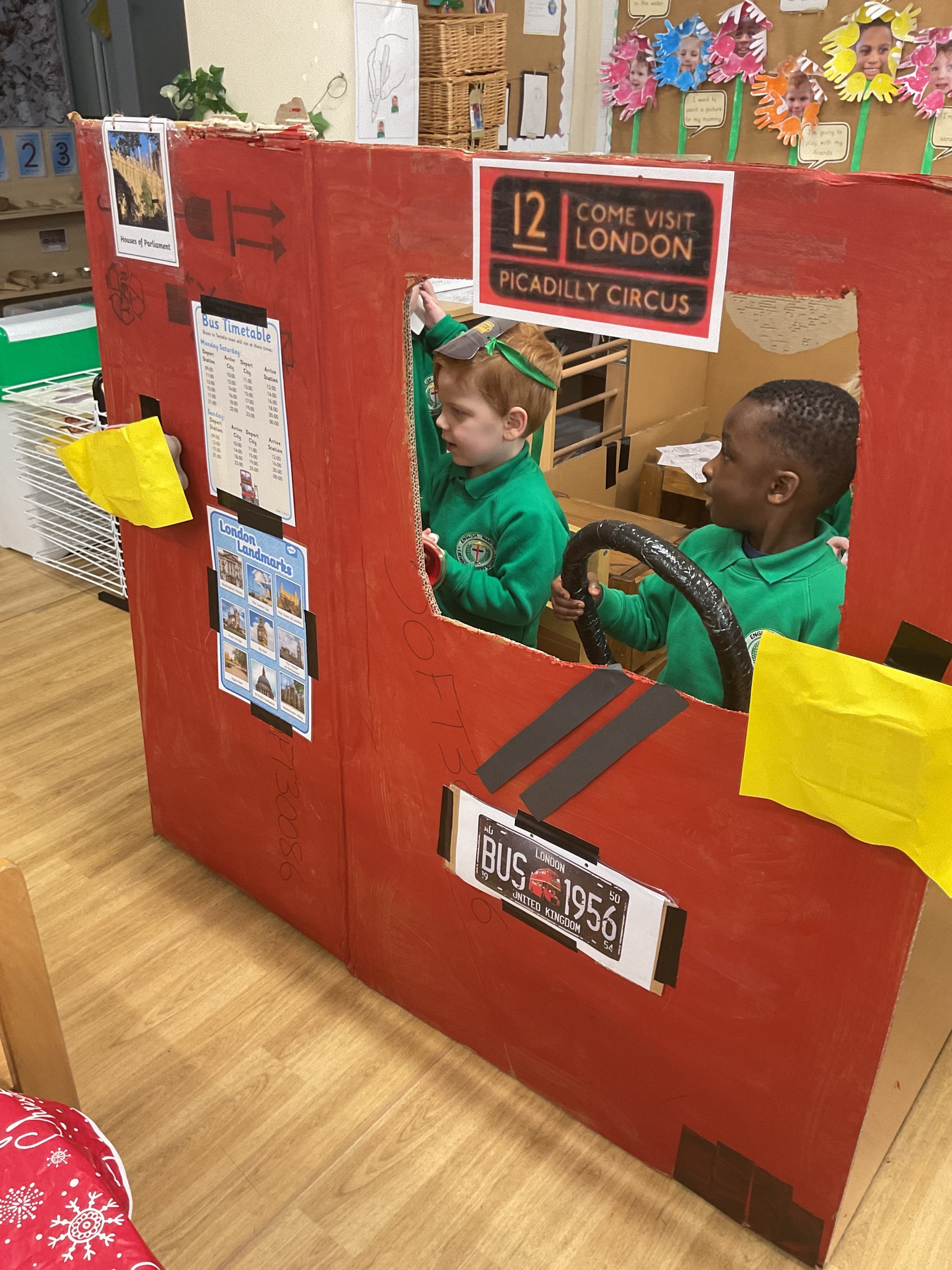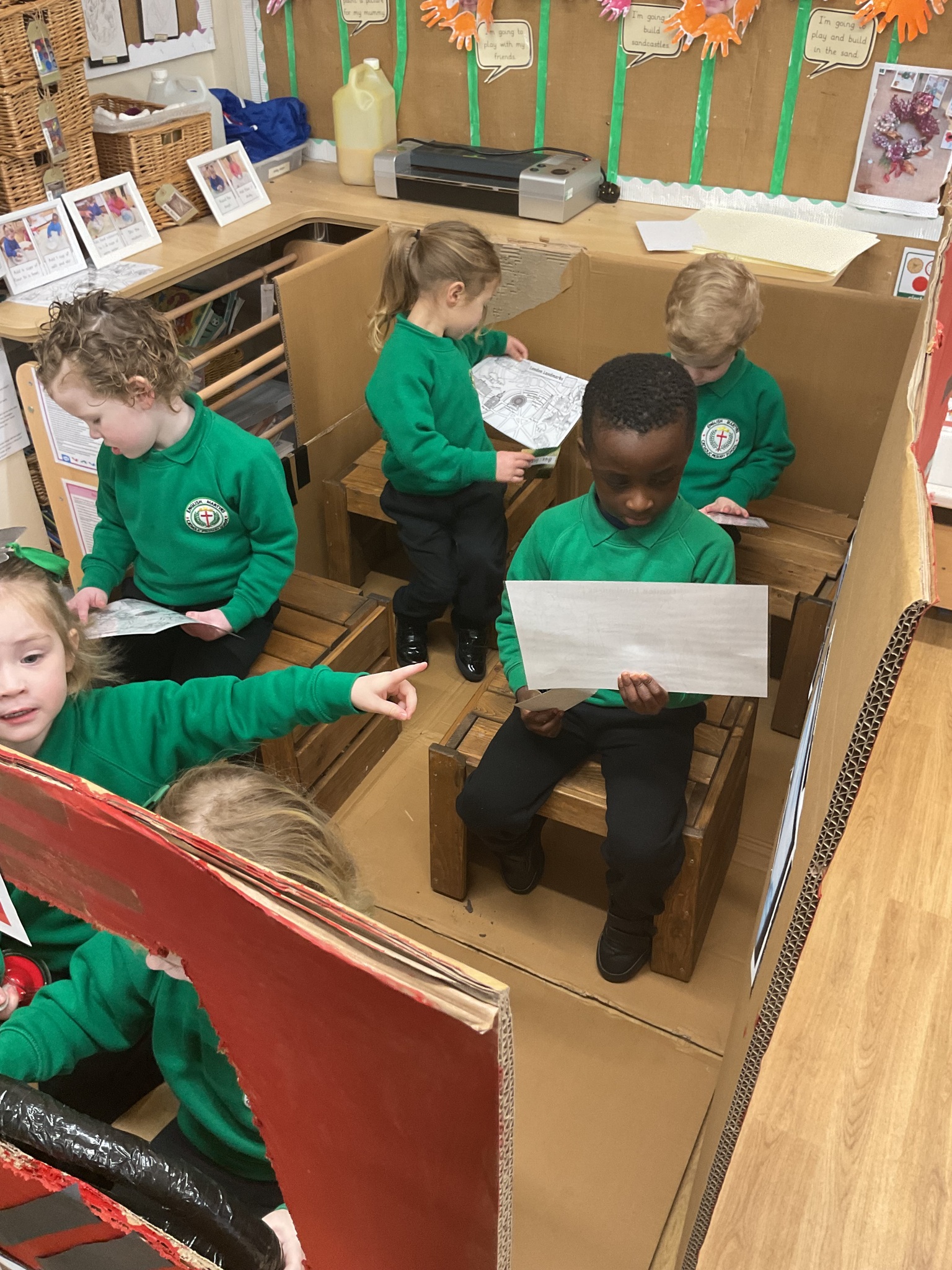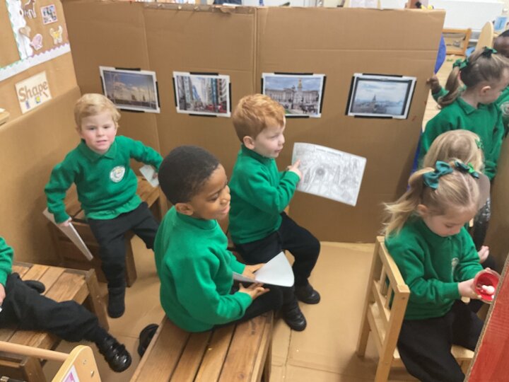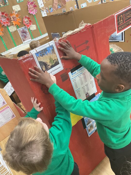 The children are continuing to enjoy reading the ‘Naughty Bus’ by Jan and Jerry Oke. This week they decided to make their own bus so they could travel around London seeing all the famous landmarks. So far they’ve visited Buckingham Palace, the Houses of Parliament and Big Ben. They are having lots of fun looking at maps and photographs and talking about their exciting journeys.